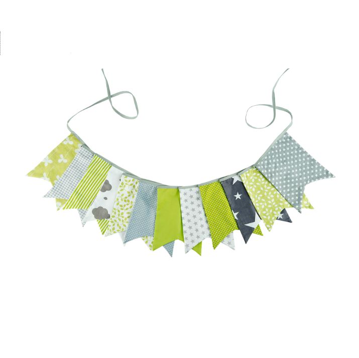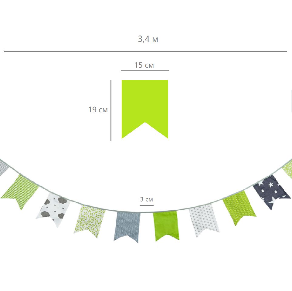 Гирлянда состоит из 12 флажков, общая длина составляет 3,4 м, расстояние между флажками 3 см, длина матерчатых флажков 2,1 м, длина лямок с обеих сторон по 50 см