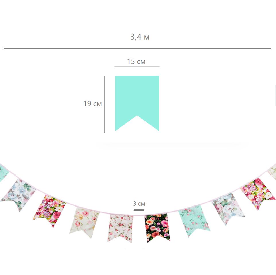 Гирлянда состоит из 12 флажков, общая длина составляет 3,4 м, расстояние между флажками 3 см, длина матерчатых флажков 2,1 м, длина лямок с обеих сторон по 50 см