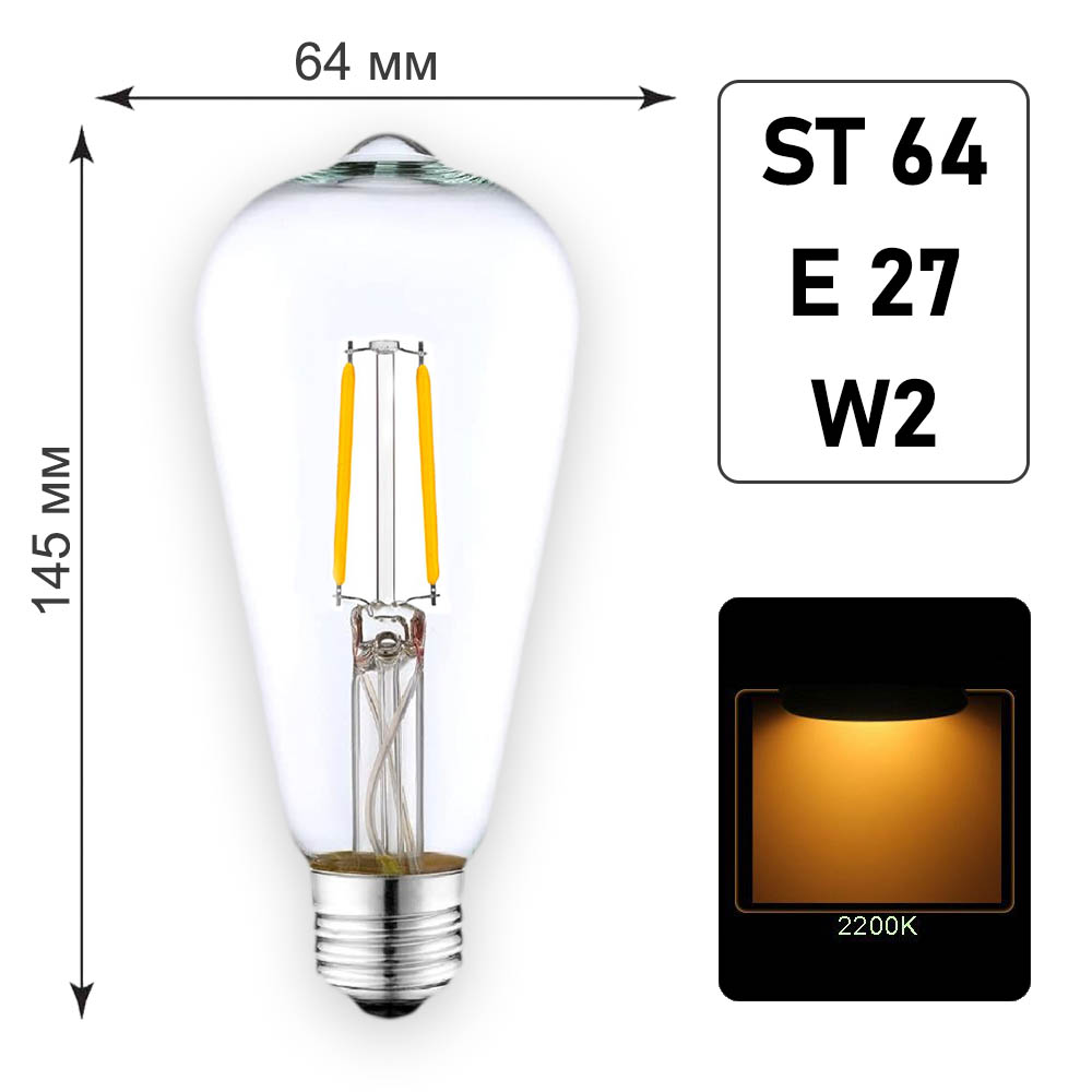 Лампа филаментная ST64 E27 W2 K2200