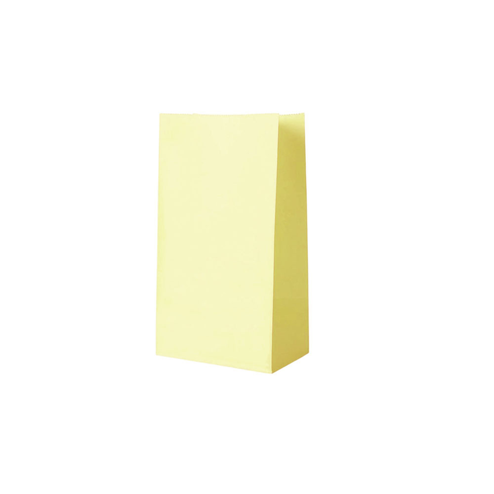 Подарочный пакет из крафтовой бумаги пастельного оттенка с белыми бумажными ручками и белой внутренней стороной.
