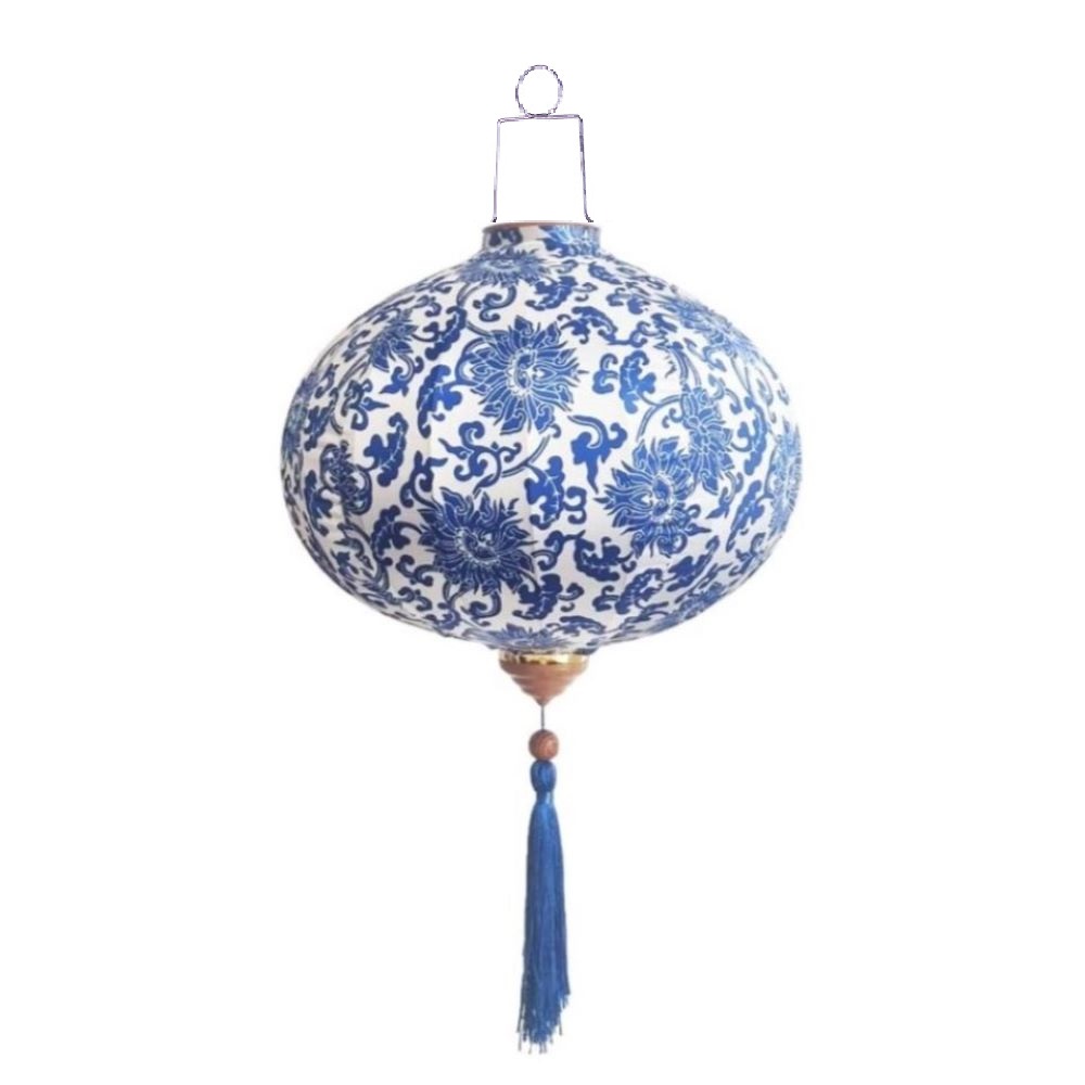 Коллекция подвесных фонарей ручной работы. Конструкция из шелкового полотна с цветочным орнаментом, металлического каркаса и подвесной системы. Модель в бело-синей цветовой гамме.