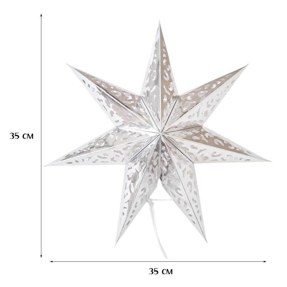 Семиконечная объемная звезда 35 см — великолепный декор из тонкого перфорированного картона. Создает красивые световые эффекты. Поставляется в сложенном виде, в комплекте шнур для фиксации объема и подвеса.