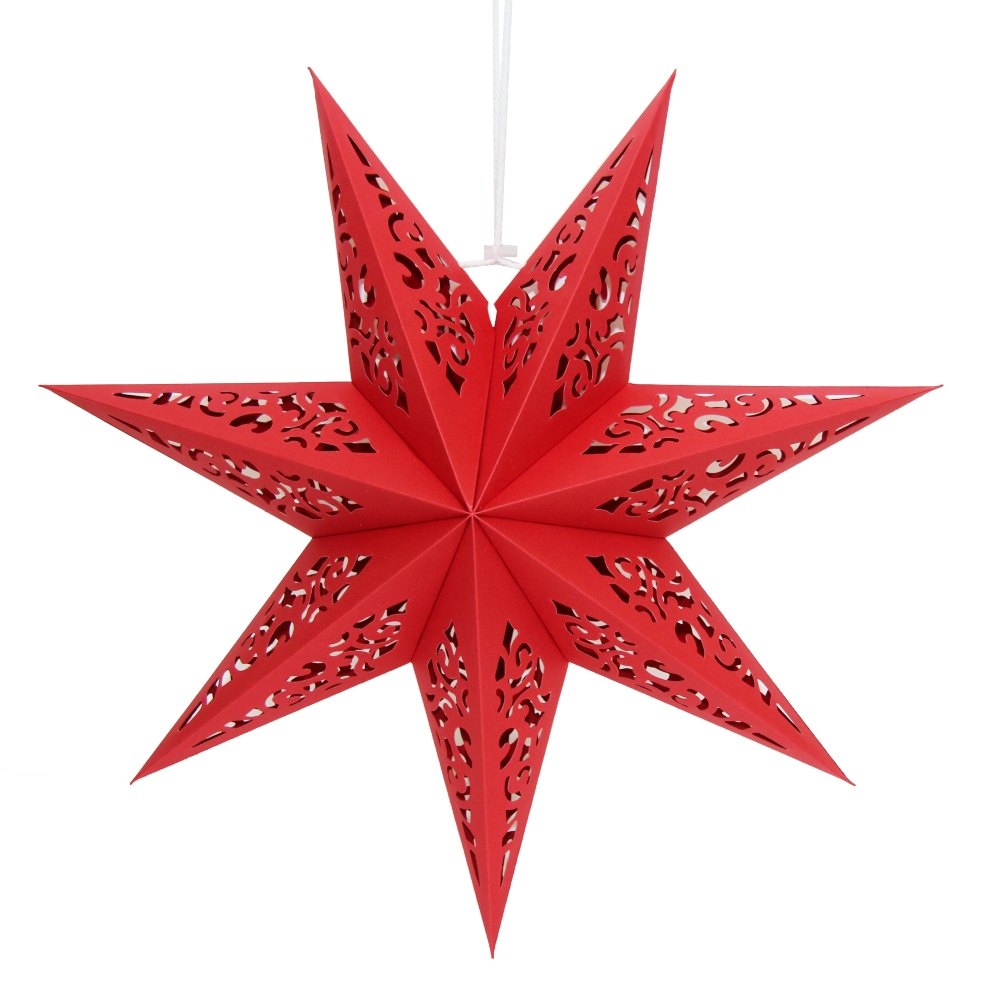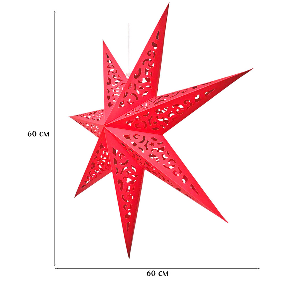 Семиконечная объемная звезда 60 см — великолепный декор из тонкого перфорированного картона. Создает красивые световые эффекты. Поставляется в сложенном виде, в комплекте шнур для фиксации объема и подвеса.